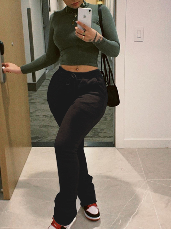Women's Solid Color High Waisted Shrink Pleat Drawstring Casual Stacked Pants